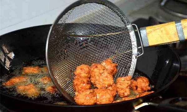 2、丸子在油中炸成型後,用筷子不停的翻轉,當丸子的顏色變色,慢慢浮起,呈金黃色。就可以撈出控油,放在笊籬上放涼就可以吃瞭。