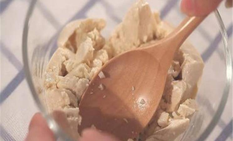 3、把豆腐放在一個碗裡,用勺子把豆腐壓成豆腐沫,主要也不要有塊,越碎越好。