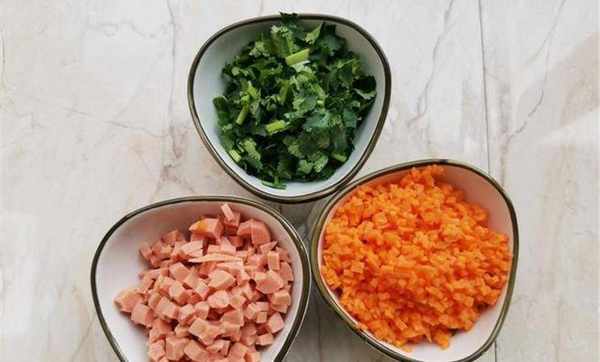2、把胡蘿卜、火腿腸和香菜切成小塊,要盡可能的碎一點。