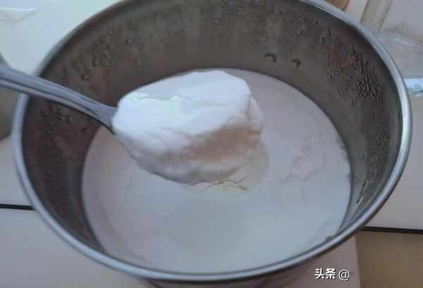 第五步:用勺子舀一勺,就可以清楚的看到我們自己做的酸奶的一個狀態。和奶酪都很相似瞭,非常濃稠,這個和牛奶的含水量是有關系的。切記做酸奶一定不要用脫脂牛奶哦。