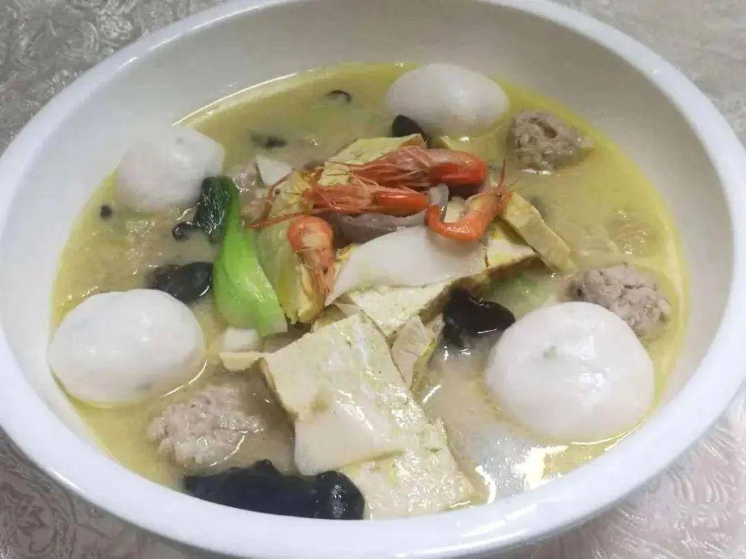 “十碗頭”是指九菜一湯,農傢三鮮就是其中主角。據說前輩們為瞭這道菜更具特點,就把魚打成魚蓉做圓子,肉打成泥做丸子,雞蛋打散煎成蛋糕,再加上肉皮、冬筍、蝦等,成一道雜龍燴菜,湯汁也更鮮美,一直留存至今。