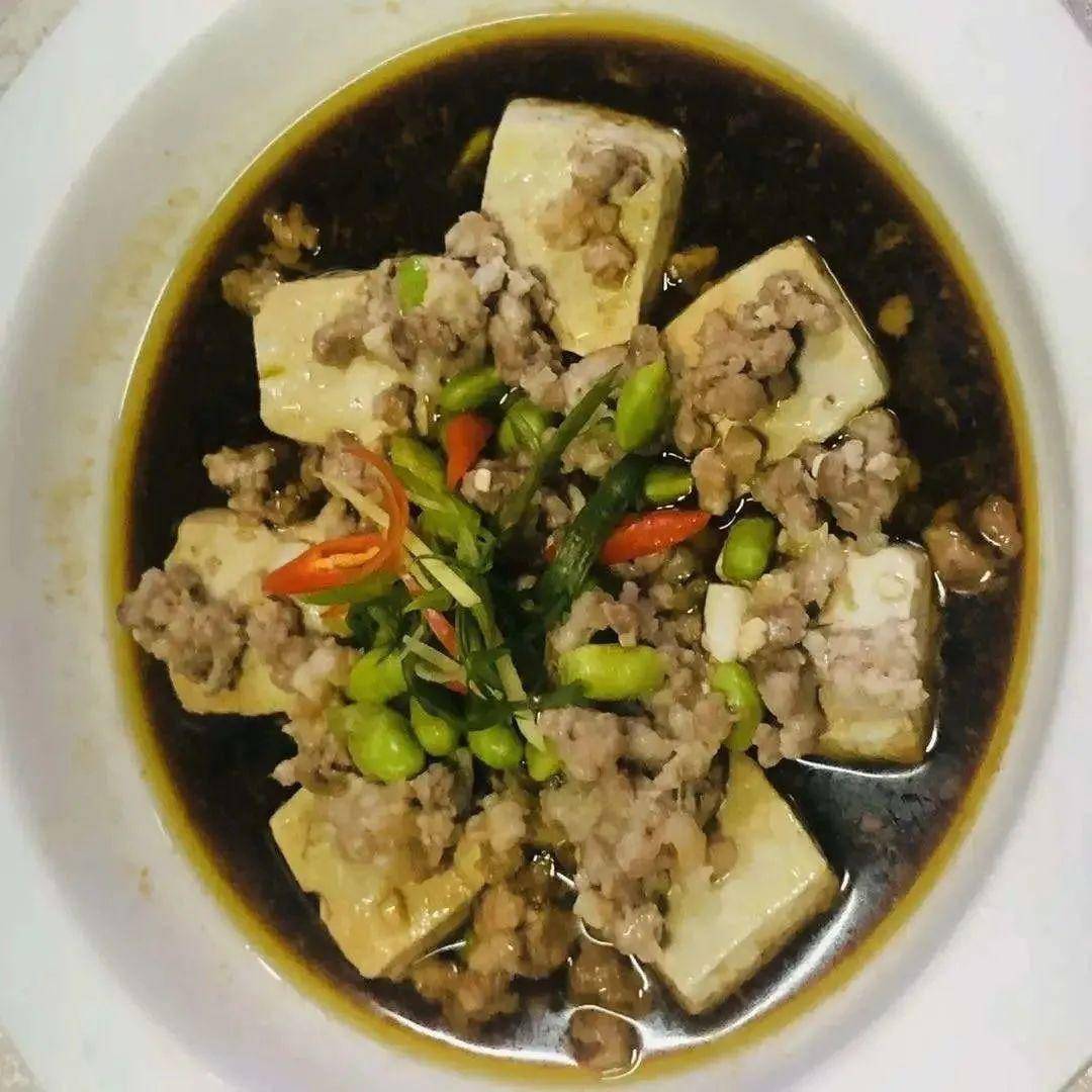 臭幹洗凈放入盤中,肉餅用醬油、料酒攪拌一下鋪在臭幹上面,然後放少許毛豆、醬油和味精上蒸鍋蒸8分鐘左右,出蒸鍋再放蔥、麻油少許即可。