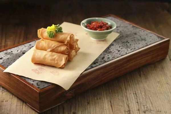 3、春卷皮用臭幹料包制成卷,放入清油中炸成金黃色,即可出鍋。