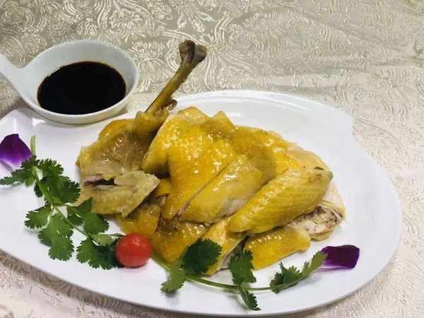 選用土雞,把雞洗殺幹凈,上蒸鍋蒸45分鐘左右即可,出蒸鍋後改刀裝盤,沾醬汁。