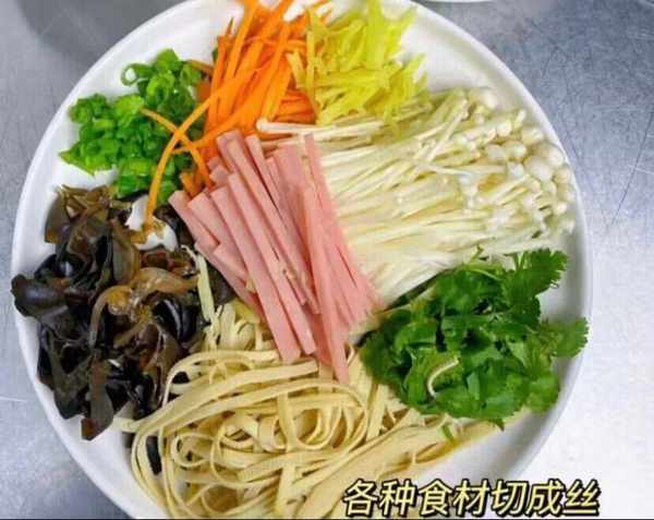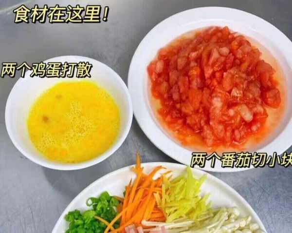 第一步:兩個雞蛋打散,準備兩個番茄切成丁(番茄可以在表皮劃個十字,用開水泡一分鐘後特別好撕皮)。各種食材切成絲備用!