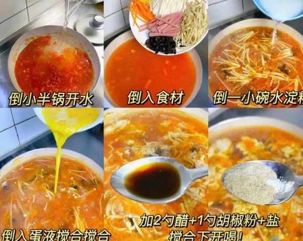 第三步:往鍋裡倒入一碗淀粉水,再把打散的蛋液倒進鍋裡,攪和一下!兩勺醋+一勺胡椒粉+少許鹽美味的酸辣湯出鍋啦~