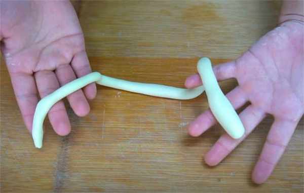 3.取出來一個面劑,揉一下搓成長條,搓成這樣一頭細一頭粗的長條。