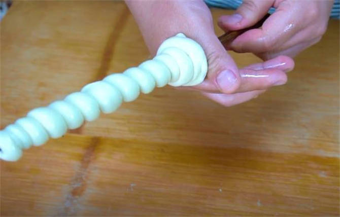 4.準備一根筷子,粗的這一頭開始繞,表面少抹一些油,把筷子取出來。