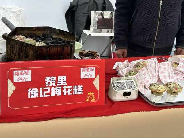來自吳江黎裡的梅花糕攤位剛開張就吸引瞭一批遊客排隊。攤主把面糊倒入正六邊形的銅制模具,拿起磨具將面糊搖晃均勻,放好餡料,撒上芝麻,再蓋上蓋子,燜個幾分鐘後,混著芝麻、核桃仁的香氣和熱氣一起撲鼻而來,熱騰騰的梅花糕就出爐瞭。