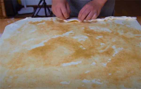 3.現在面團已經發好瞭,撒一些面粉防粘,按壓排氣,搟成一張大的餅皮,在上面抹一層油酥,抹勻之後從一端卷起來。
