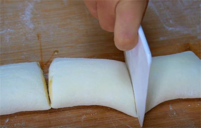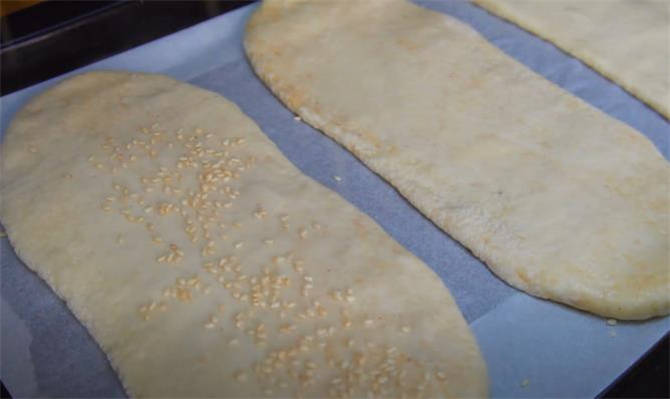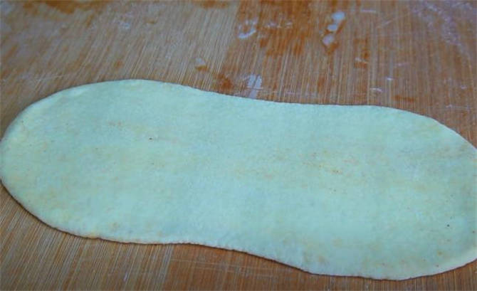 6.反過來按扁,用搟面杖搟長,這樣餅胚就做好瞭。