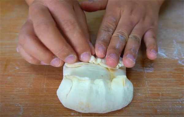 5.把面劑兩頭收緊,然後兩邊收緊的這一塊分別向裡對折。