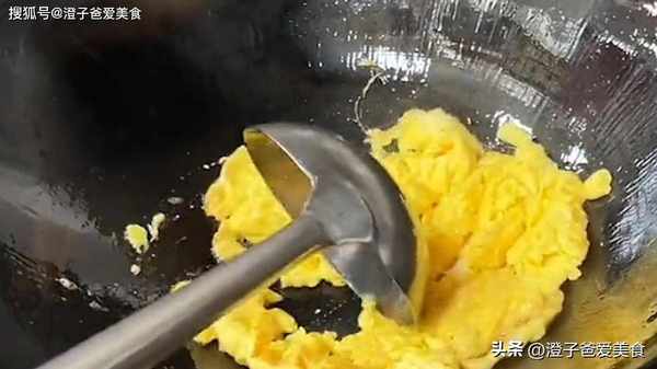2.碗中打5個雞蛋,加入少許食鹽,一點胡椒粉來去腥,用筷子攪打均勻,熱鍋涼油,將雞蛋倒入鍋中,雞蛋定型以後,用勺子輕輕的推動,將雞蛋底部煎至金黃,翻過來煎另一面,盡量煎的老一點,吃起來更鮮香,分成小塊,倒出控油備用。