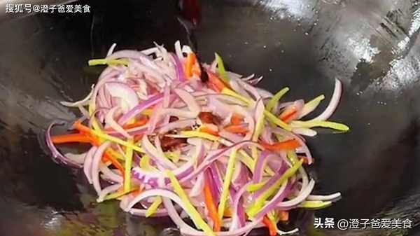 3.鍋中再次加入油,將洋蔥絲倒入鍋中,大火翻炒均勻,將洋蔥絲炒出香味。再倒入辣椒絲,繼續的煸炒均勻,炒制時不要加水,調味加入少許食鹽、味精、胡椒粉、生抽,一些蠔油和老抽來上色,繼續翻炒均勻,將所有食材炒至入味。