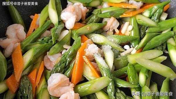 5.鍋中倒入少許食用油,油熱後放入薑蒜爆香,爆香後放入蘆筍、蝦仁,快速翻炒均勻。接著開始調味,加入適量鹽、白糖提鮮,一點雞精,再翻炒入味。最後再倒調好的淀粉水,快速的翻炒均勻,就可以出鍋裝盤瞭,