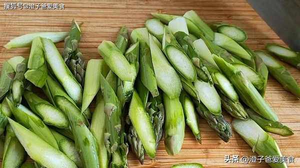 1.把蘆筍一部分的老皮刮掉,再清洗幹凈,然後切成大小均勻的滾刀塊,裝入盤中備用。