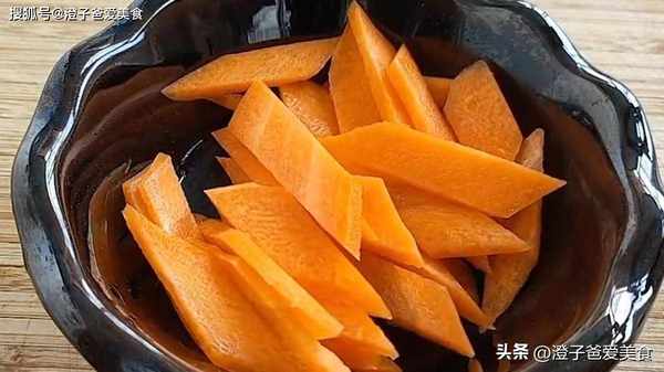 2.準備一個去皮的胡蘿卜,切成小段,再切成菱形片,切好裝入碗中,生薑先切片,再切成小丁,幾粒大蒜切成片,裝入小盤中備用。