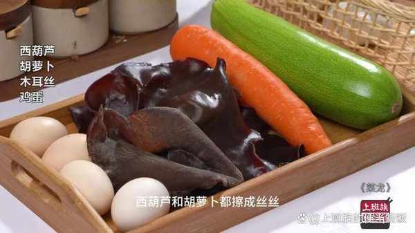 先把木耳、胡蘿卜、西葫蘆切成絲絲備用。