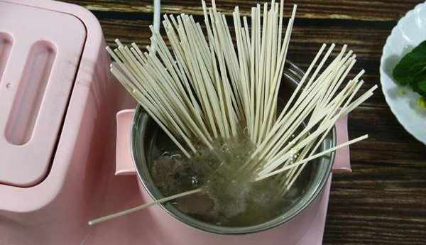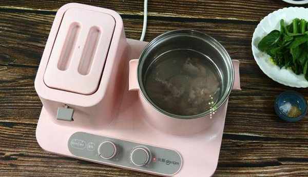 等瘦肉煮至變色、變熟時,放入食鹽和雞粉煮一會,再把發酵空心掛面放進去煮6-7分鐘。
