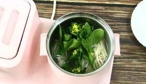 面條煮至4分、5分鐘時,再把洗好的菜心放進去一起煮,煮到菜心變色變軟或者菜桿的白芯很小時就可以瞭;把煮好食材撈出放碗裡,再加點湯汁,另外可以用適量生抽和花生油調蘸醬蘸著吃。