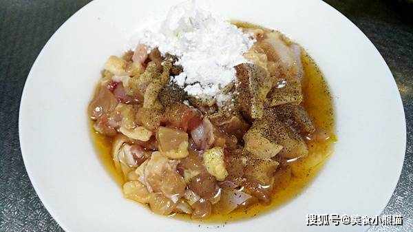 3、雞腿肉用適量鹽、生抽、胡椒粉、黃酒、淀粉抓勻,醃制10分鐘後,加少許油拌勻。