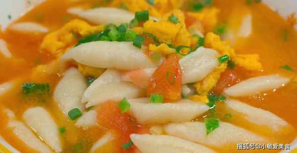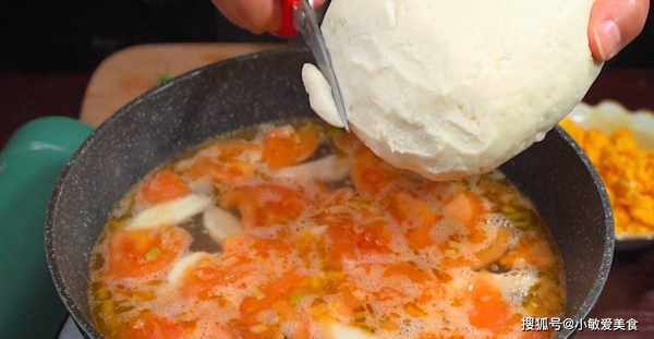 7、鍋留底油,下入蔥白,小火炒出香味,再放入切好的西紅柿,中火翻炒,炒出西紅柿的汁水,再加入一大碗清水。水開後用剪刀把面團一片片的剪下來,剪成這樣的面魚狀,大小要均勻一點,全部剪好後開大火,水開後再煮分鐘。