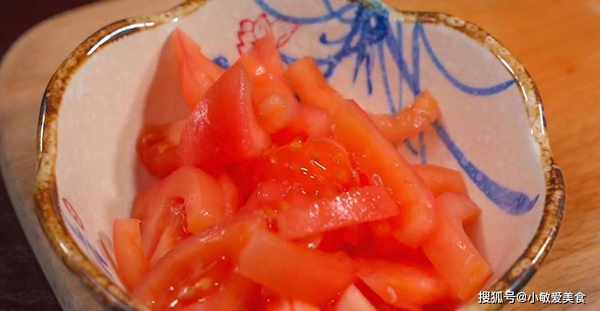 2、接下來準備一個西紅柿,打上花刀,倒入開水燙上一分鐘左右,這樣更方便。去皮再全部切成小塊,裝入碗中備用。