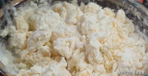 4、山藥已經蒸好瞭,用勺子壓成細膩的山藥泥,盡量壓得細膩一些,再加入適量面粉,少量多次的加入純牛奶,也可以加清水、面粉和牛奶,沒有具體的量,可以少量多次的加,能夠攪拌成這樣的面絮狀就可以瞭。