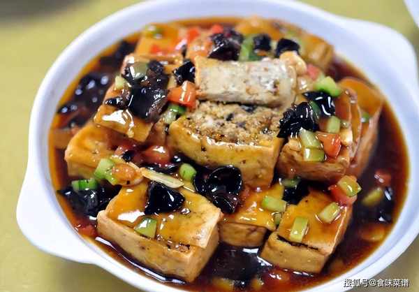 博山豆腐箱是淄博菜系中的傳統名菜之一,也被稱為齊國豆腐箱。這道菜的做法一般是將一整塊豆腐切成六個方丁,然後將其油炸至金黃,再挖出豆腐塞入餡料蒸熟,還要加入芡汁。這道菜以豆腐為主料,但皮餡鮮美,口感可謂一絕。據說乾隆帝嘗瞭都說好。