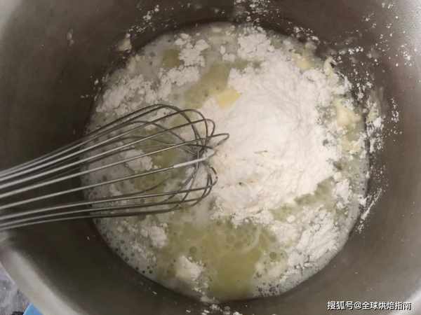 2 / 加入過篩後的低筋粉,高筋粉繼續加熱至鍋底出現薄膜。