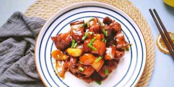 2.鍋裏熱油,放入冰糖炒起糖色時,放入熱水,放入蒜薑片和香料,調味料煮開。接著倒入炒好的五花肉塊,小火慢慢燉制軟糯入味後,收汁即可出鍋。