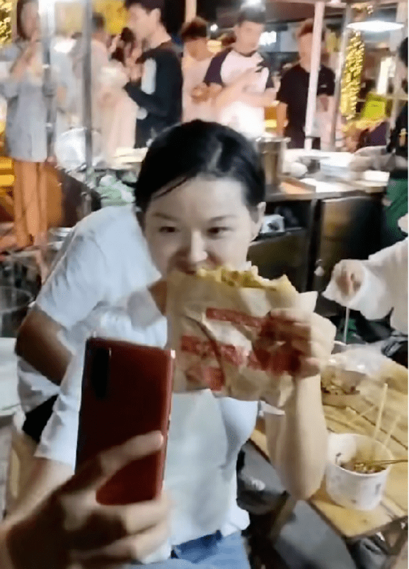 ▲網紅攤戶“李妹妹”品嘗陳明英的鮮肉餅。(受訪者供圖)