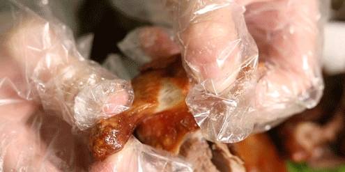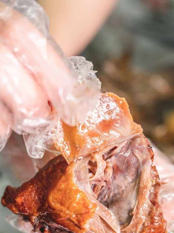 剛剛出爐的乳鴿,就要趁熱吃,帶上手套順著結構撕開,肉汁立刻奪人視線,香濃的肉香味也更明顯!