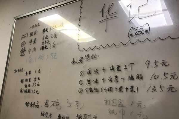 剛開始,它就在旁邊的都市便捷飯店門口擺攤,今年才有了固定的門店,品種和售價都寫在店內的一塊白板上(特意問了店主,這是一個小朋友手繪的)。