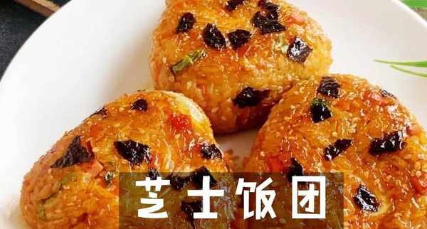 3、將飯鋪在保鮮膜上,然後放入芝士片,包好整成三角形,放在不粘鍋上,小火煎熱,期間放上海苔和芝麻,刷上步驟一的醬汁,兩面煎至金黃即可!