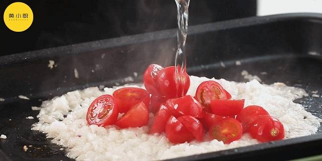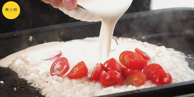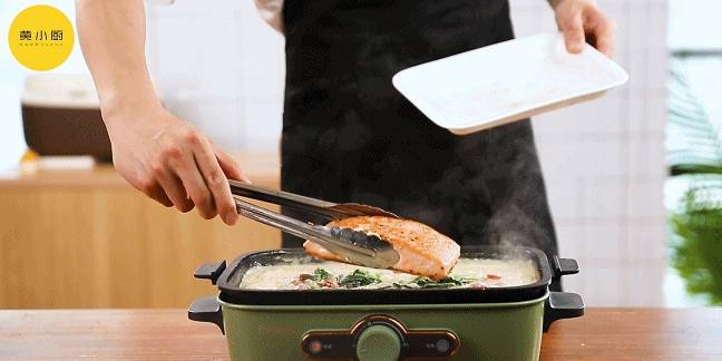 放入小番茄、白葡萄酒、淡奶油、鹽、黑胡椒、菠菜、三文魚,稍煮一會即可