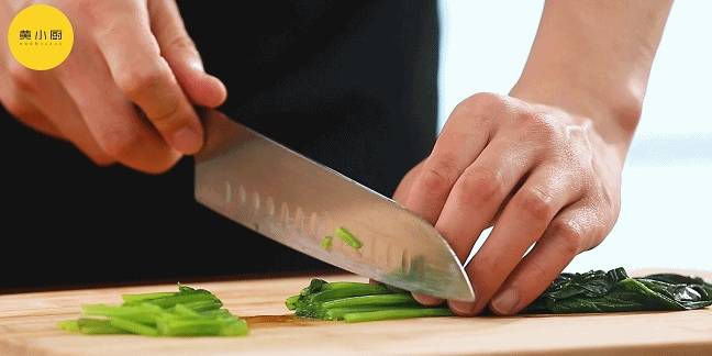 烹飪機燒水,放入網籃,燙熟菠菜,切成兩段;小番茄切兩半