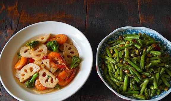 午餐:大蝦炒藕片+素炒豇豆+米飯