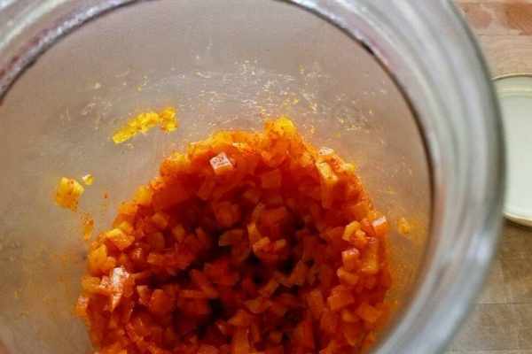 6、這是準備好的辣蘿卜,可以自己做,也可以直接買現成的。蘿卜切成小丁放在濃鹽水當中浸泡一夜,然後控水之後撈出晾幹,再加入適量的花椒粉,辣椒粉醃制一下就可以瞭。
