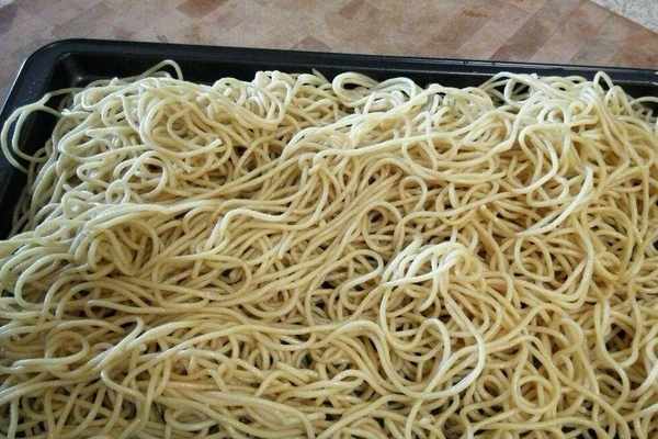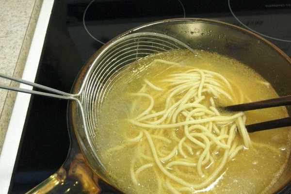 2、面條水開之後下鍋,保持大火水開,加入面條,先煮半分鐘,不要完全煮熟,等到什麼時候吃,什麼時候下鍋焯水,半分鐘左右就可以瞭。撈出來的面條要加入適量的香油,防止面條之間相互粘連。