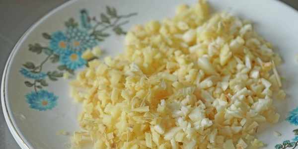 再來切點薑末和蒜末,全部切好後也裝入盤中備用。