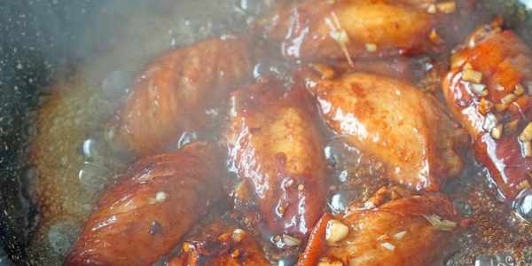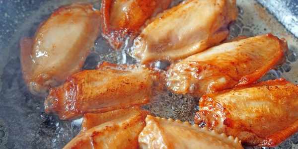 10、現在把醃好的雞翅放進去,小火煎至一面煎成金黃後翻面