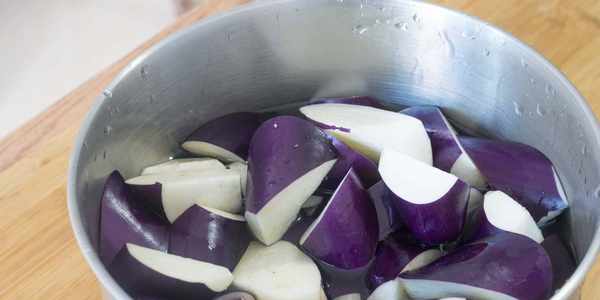 先把茄子蒂切掉,然後再切成滾刀塊兒,滾刀塊兒除瞭好看還更好入味兒,全部切好後把茄子裝到一個大一點的容器裡,加一勺鹽後再加清水,茄子用水泡著可以防止氧化變黑;