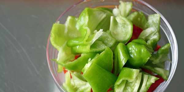6、現在我們來切一個紅菜椒,切成小塊後裝入盤中備用,切一個青菜椒,切好後裝入盤中備用。