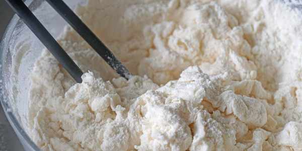 3、碗中加200克面粉,加2克鹽增加面粉的筋性,攪拌均勻後先用60毫升的開水燙面,邊加邊攪拌,攪成這種絮狀後再加50毫升的涼水和面,然後再加10克的食用油。