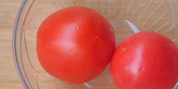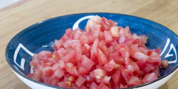 3、再來1個西紅柿,先切片,再切丁,切好後也先裝起來;