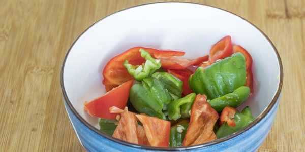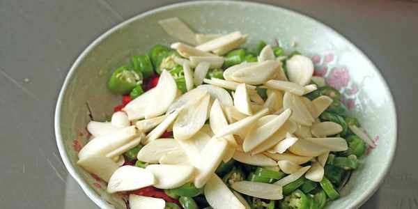 再切點蒜片,切好後也裝入青紅椒的碗中備用;