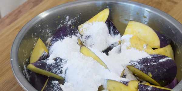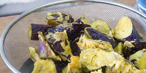 6、接著我們就可以起鍋熱油瞭,油溫7成熱放入茄子炸,全程大火,這樣茄子才不會吸油,炸到定型後再用筷子去翻動一下茄子,炸至茄子看起來有點焦黃就撈出來控油