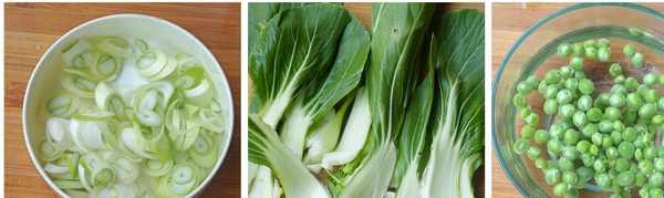 5、切一根大蔥,掰一朵上海青,把金針菇的根部切掉,掰成小朵,剝點青豆,配菜全部配齊;