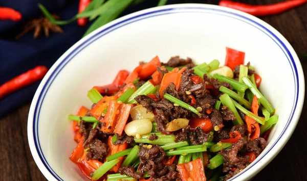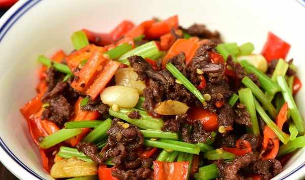 6、鍋中留底油,放入薑末、蒜末、花椒爆香。隨後倒入切好的青紅椒圈和芹菜段,翻炒均勻。把炒好的牛肉倒入鍋內,加半勺鹽、2勺生抽、半勺白糖調味,炒勻以後就可以出鍋瞭。